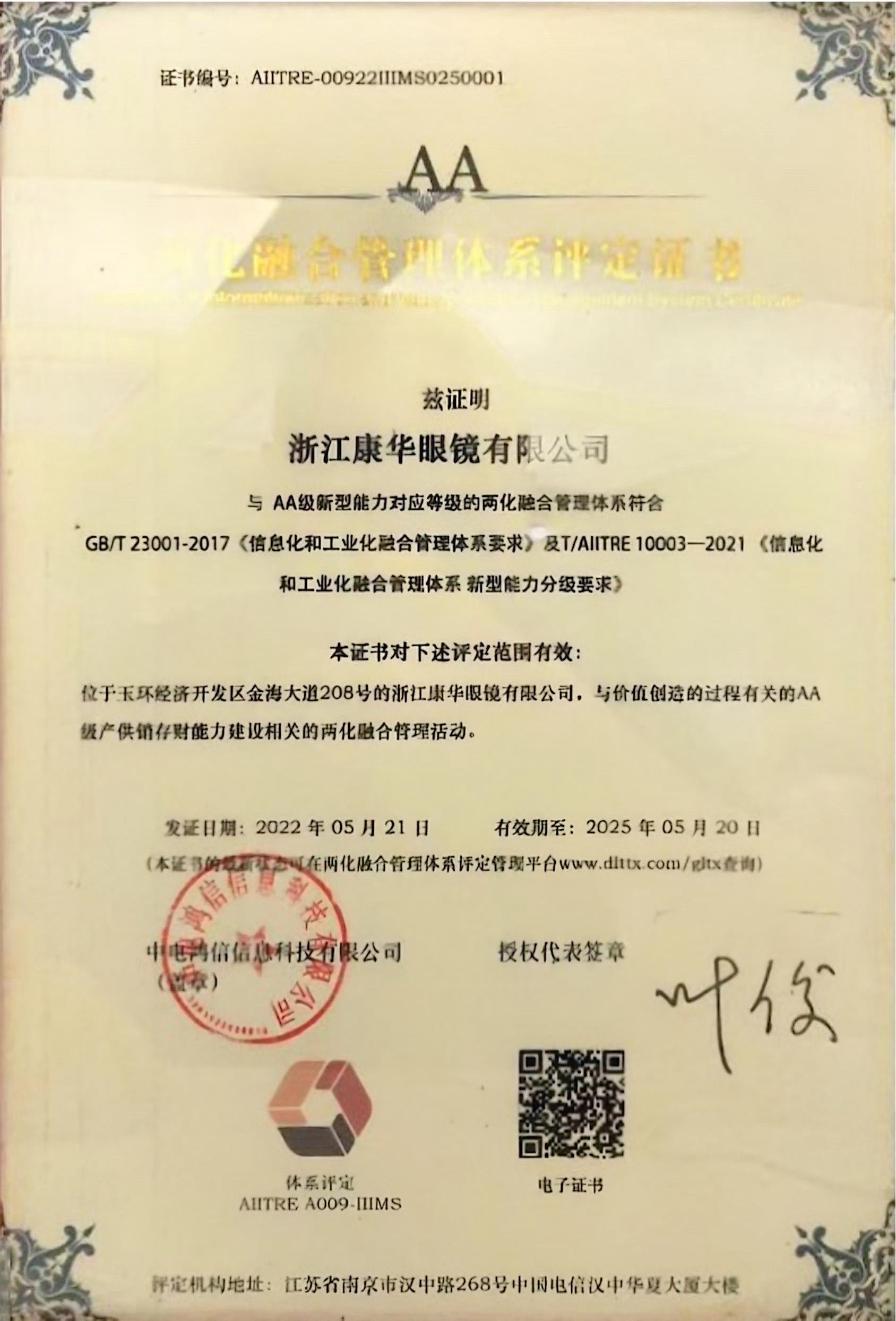 符合AA级新型能力对应等级的两化融合管理体系