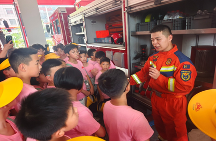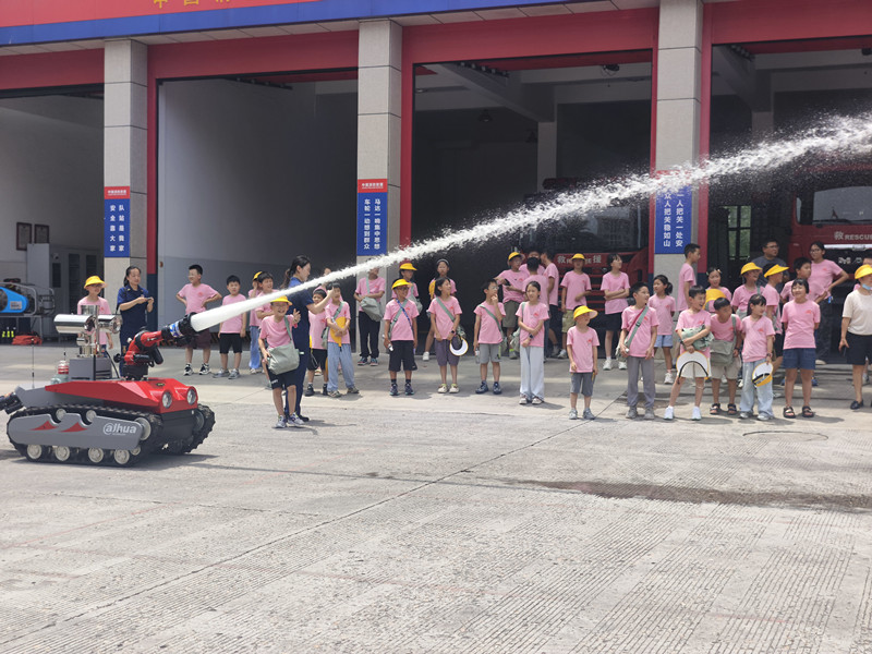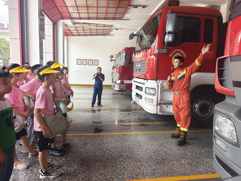 随后,大家前往玉环市消防救援大队,消防叔叔刚摆好攀爬架,胆子大点的孩子绑上安全防护爬上云梯就和消防员比速度;洒水车机器人旋转喷水,水幕映出七色光;消防陈列馆里,小小“英雄”们戴上头盔、扛上水枪,过足了灭火瘾。