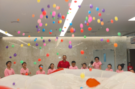 全国五一劳动奖章获得者叶海辉一亮相,便以一句“口香糖,粘哪里?”点燃全场——孩子们像被施了魔法般飞奔、贴肩、抱团,笑声此起彼伏;紧接着,巨幅降落伞“嘭”地撑开,彩绸如云朵腾空,孩子们“嗖”地钻进伞下,仿佛小兔子躲进巨型蘑菇避雨。大家围成一圈,齐心抖动伞面,五彩海洋球顿时化作翻涌浪花,门诊大厅瞬间变成欢乐的海洋。